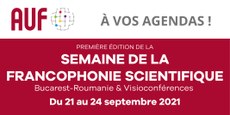A Agence Universitaire de la Francophonie (AUF) está organizando a primeira edição da Semaine de la Francophonie Scientifique de 21 a 24 de setembro de 2021 na Universidade POLITEHNICA em Bucareste - Romênia, no formato híbrido, contando com algumas presenças físicas e transmissão por videoconferências em todo o mundo.