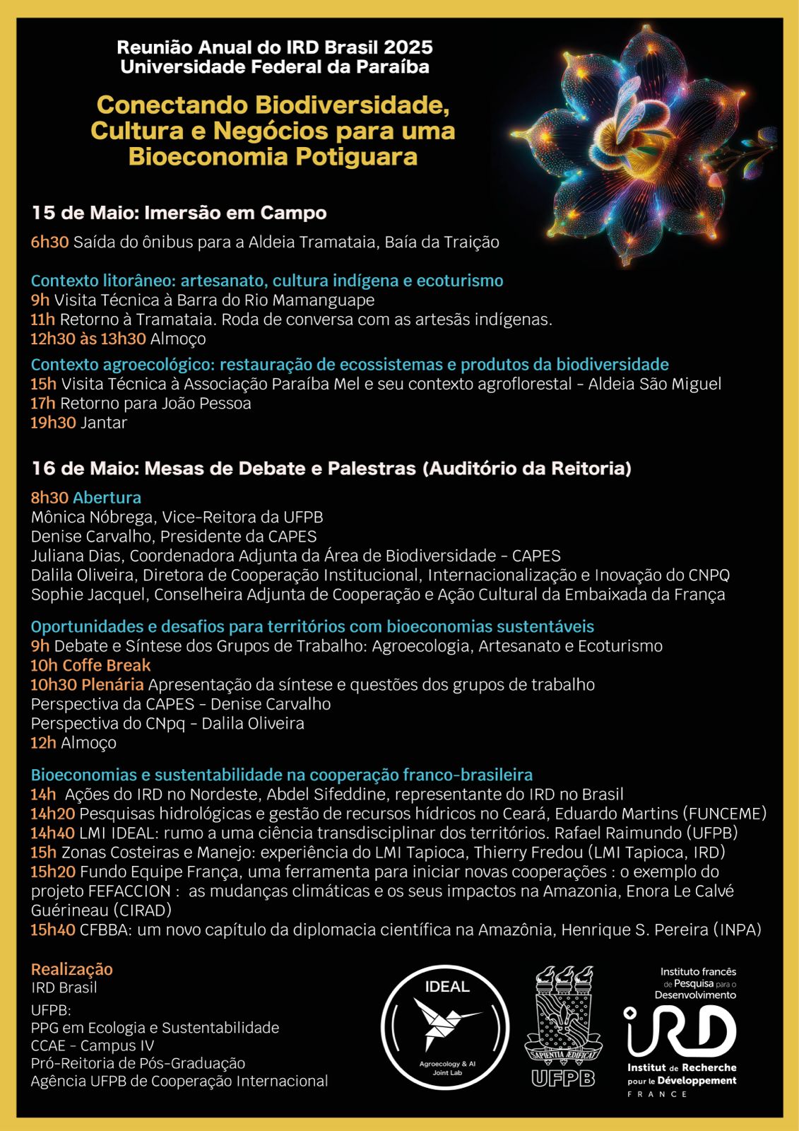 O encontro é promovido pela UFPB em conjunto com o Instituto Francês para o Desenvolvimento (ou, na sigla em francês, Institut de Recherche pour le Développement - IRD), órgão ligado ao governo francês e que atua no Brasil há décadas, estabelecendo parcerias entre pesquisadores dos dois países e financiando pesquisas. No primeiro dia, serão realizadas visitas técnicas a territórios indígenas nas proximidades do campus IV e no segundo dia haverá mesas de debate e palestras, no auditório da reitoria, em João Pessoa.