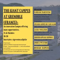 O projeto "Internacionalização e interculturalidade Universitária” promoverá uma palestra online no próximo dia 15 de outubro, às 10h30, com convidados internacionais. Nesta edição do projeto, os palestrantes serão: Floriane Marcuccini, coordenadora do programa GIANT; Amanda Gomes de Carvalho, estudante do PhD no CEA-LETI; Laura Wollesen, estudante do PhD no ESRF; Abderrahmane Ghimouz, estudante do PhD no CNRS-LPSC; Joshua Pwavodi, estudante do PhD no UGA-IS Terre; e Boubakr Rahmani, estudante do PhD no Grenoble-INP-G2ELab. A apresentação será em língua inglesa, com o título “The GIANT Campus at INP-Grenoble (France): an innovation Campus offering many opportunities”.