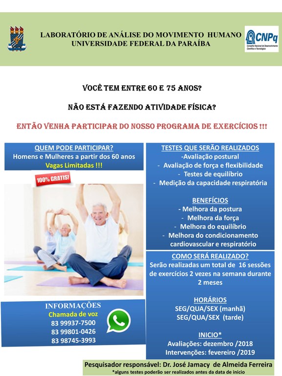 Você está aqui: Página Inicial > Contents > Notícias > Laboratório de Análise do Movimento Humano, disponibiliza programa de atividades físicas para pessoas de 60 a 75 anos sem nenhum custo para os participantes.