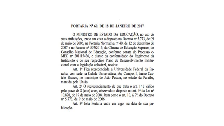 Portaria de Recredenciamento da UFPB - Janeiro de 2017