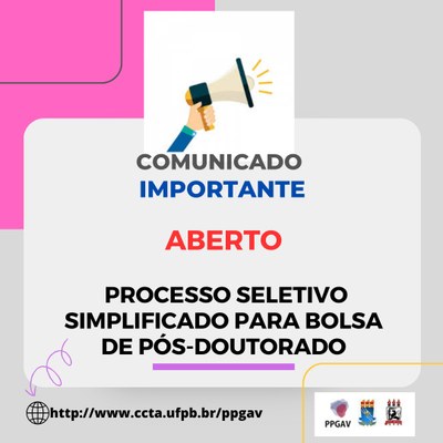 O Programa Associado de Pós-Graduação em Artes Visuais da Universidade Federal da Paraíba e Universidade Federal de Pernambuco (PPGAV UFPB/UFPE) abre processo de seleção de uma (01) vaga para bolsa de Pós-Doutorado, cujo processo será regido por essa Chamada Interna nos termos do Edital no 09/2023 - Concessão de Bolsas de Pós-Doutorado - da Fundação de Amparo à Pesquisa do Estado da Paraíba (FAPESQ-PB).