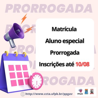 Período de matrícula alunos(as) especiais: 31/07/2023 a 10 de agosto de 2023