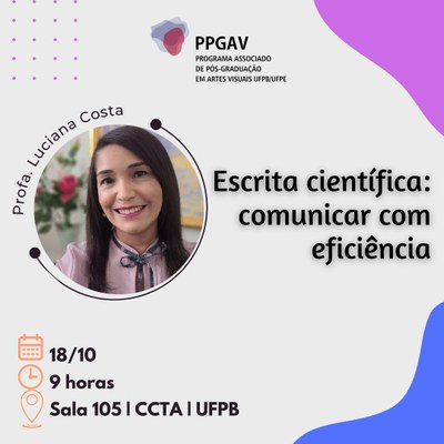 O PPGAV promove a palestra "Escrita científica: comunicar com eficiência" a ser ministrada pela Professora Dra. Luciana Costa. Na palestra serão abordadas questões como produção e comunicação científica, como elaborar artigo científico e possibilidades de publicação em periódicos científicos.