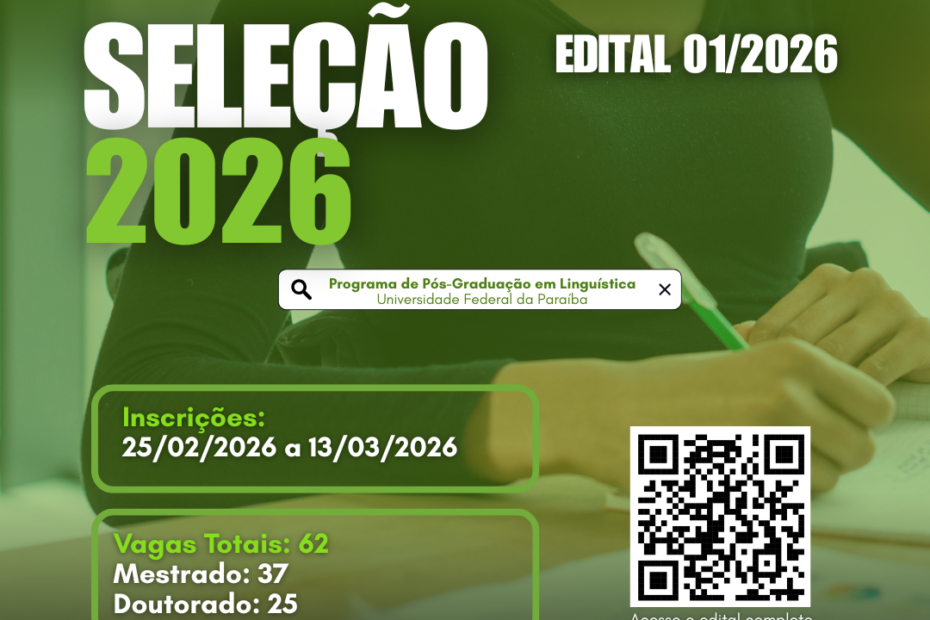 Resumo informativo sobre o Edital 01/2026 do Processo Seletivo para os cursos de Mestrado e Doutorado do Programa de Pós-Graduação em Linguística (PROLING/UFPB) para ingresso no semestre 2026.2. Visão Geral do Processo O processo seletivo destina-se ao preenchimento de vagas em cinco linhas de pesquisa… Continue a ler »Processo Seletivo 2026 – Mestrado e Doutorado Acadêmicos