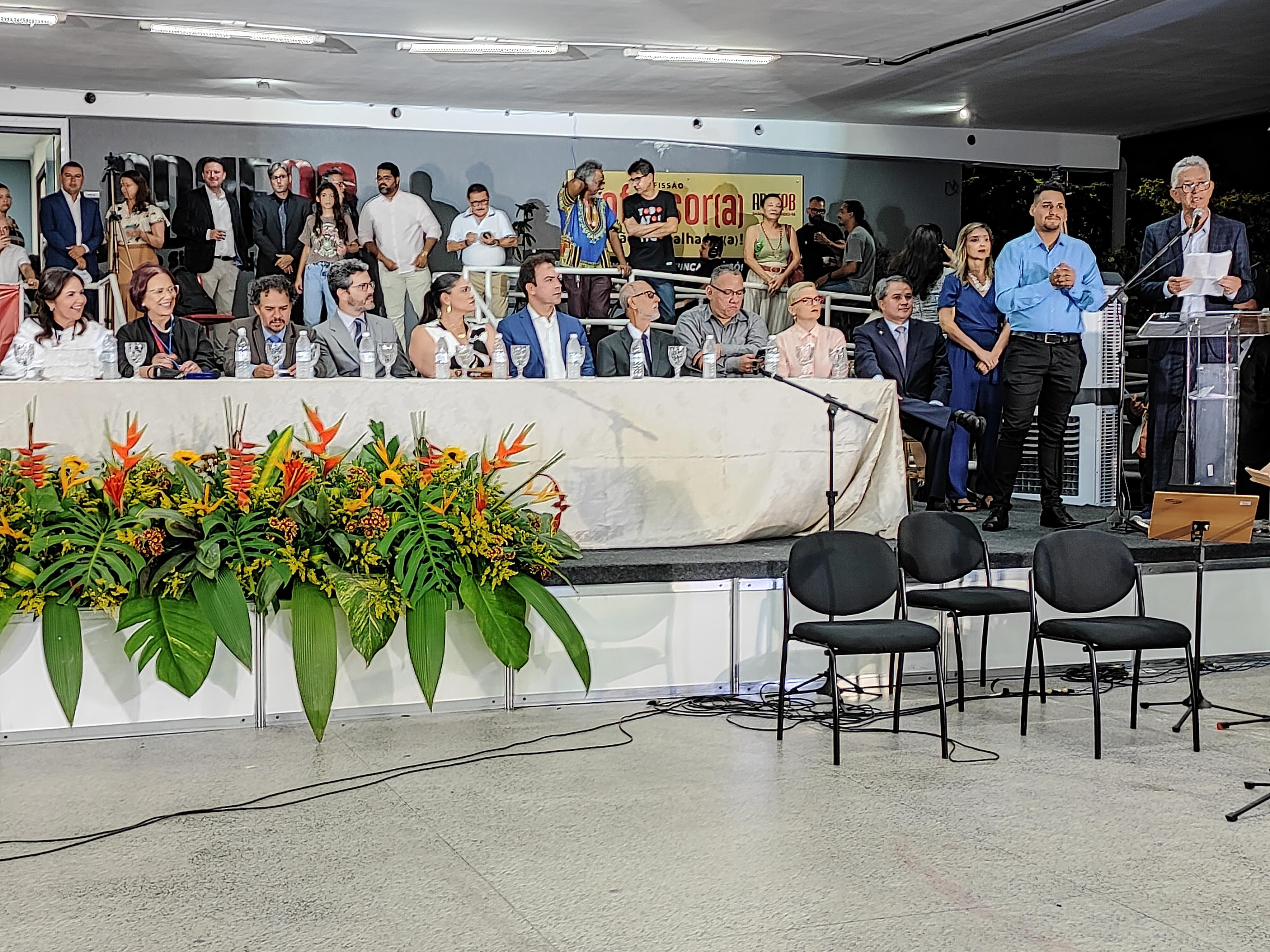 Presidindo a solenidade, o decano dos Conselhos Superiores da Universidade, professor Zaqueu Ernesto, convidou a Reitora Terezinha Domiciano e os demais membros da comissão de honra – o ex-Reitor da UFPB Neroaldo Pontes; o presidente do Sindicato dos Professores da UFPB, professor Edson Franco; a servidora técnico-administrativa Rafaella Camilla Prado de Brito, da diretoria do Sindicato dos Trabalhadores em Ensino Superior do Estado da Paraíba (SINTESPB); e o estudante Vinícius Oliveira, representante do Diretório Central dos Estudantes (DCE) – para a mesa que, ao todo, contou com 18 membros, o que dá a dimensão da importância e representatividade do momento.